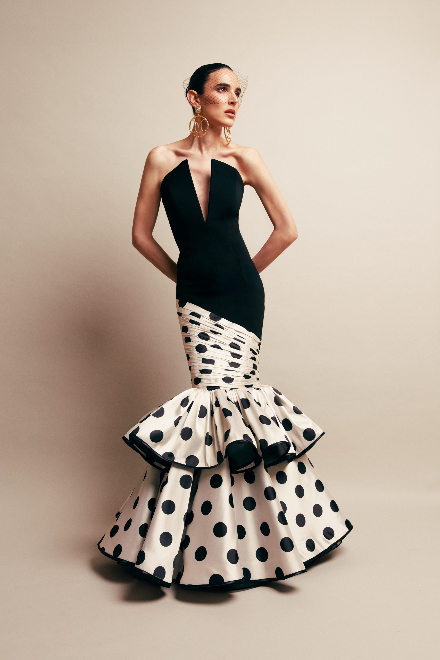 En Mayo encontraremos lineas muy femeninas con aires ochenteros llenos de opulencia y sofisticación. El estampado de lunar y flores cobra protagonismo compitiendo con bordados a mano y pedrería en cristal de Swarovski. El clavel, flor empleada en las cruces de mayo obtendrá el papel de leitmotive, siendo empleado en diferentes versiones, adornando escotes en versión joya. La gama cromática se centra en el binomio blanco y negro que en ocasiones de fusiona con dorado, el punto de color lo ponen el rojo y fucsia aportando gran intensidad a los looks. Materiales como tafetán de seda plisado, tul bordado en cristal de Swarovski, lamé, terciopelo y crepé de seda serán los que conformen esta colección en piezas únicas mimadas con gran detalle.